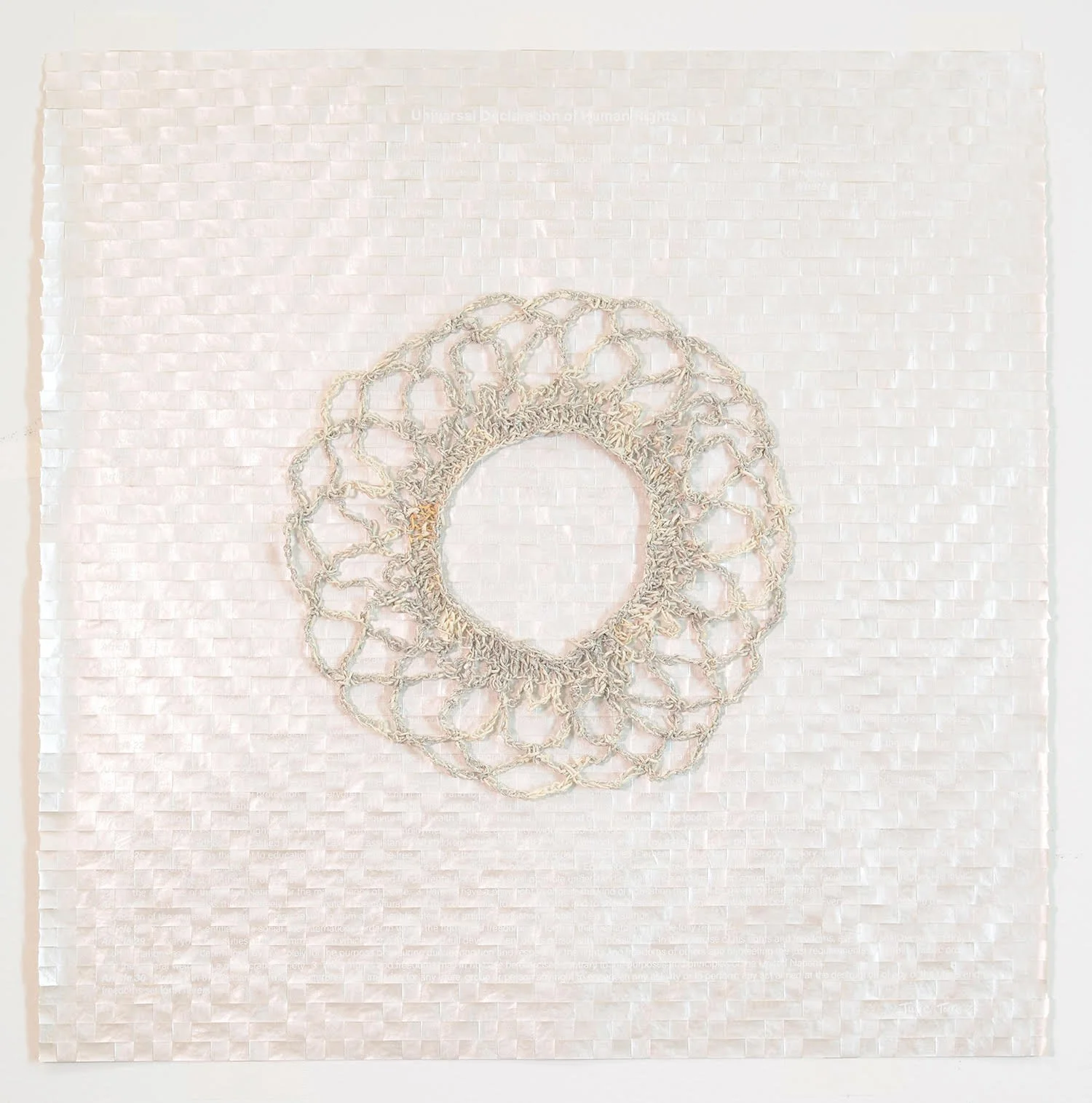 Image 1 of 1 Universal Human Rights $12,000.00 2023Woven screenprint with crocheted paper from international law treatise 32.5 x 32.5 in. Add To Cart Added! 2023Woven screenprint with crocheted paper from international law treatise 32.5 x 32.5 in.